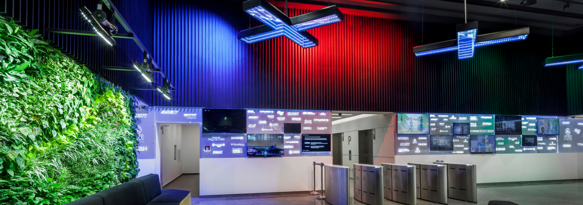 Und für den erstaunlichen Empfangsbereich verwendeten wir Myriaky Outdoor-Leuchten, um eine industrielle, energiegeladene Stimmung, typisch für die EA-Marke, zu erschaffen. Das industrielle Gefühl wurde auch durch eine Hochregalleuchte verbessert, die einer großen Reflektorlampe ähnelt - Kaven. Kaven wurde mit farbigen LEDs ausgestattet, die jeweils eine andere Farbe emittieren - rot, grün, blau und so weiter.